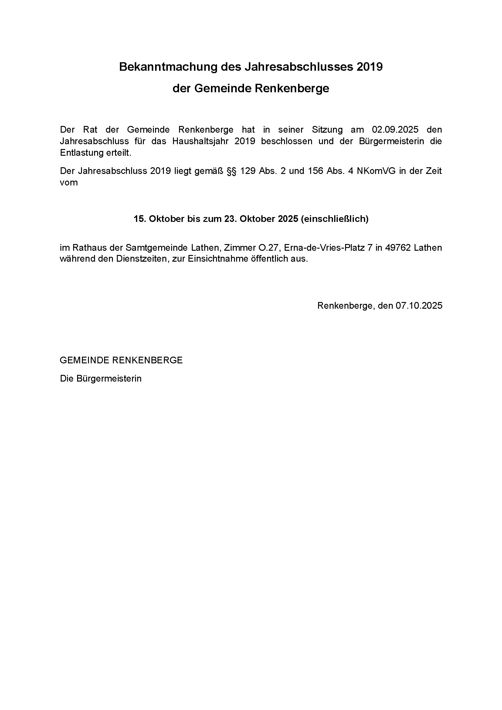 Bekanntmachung des Jahresabschlusses 2019 der Gemeinde Renkenberge Okt. 15, 2025 | Gemeinde Renkenberge, Öffentliche Bekanntmachungen