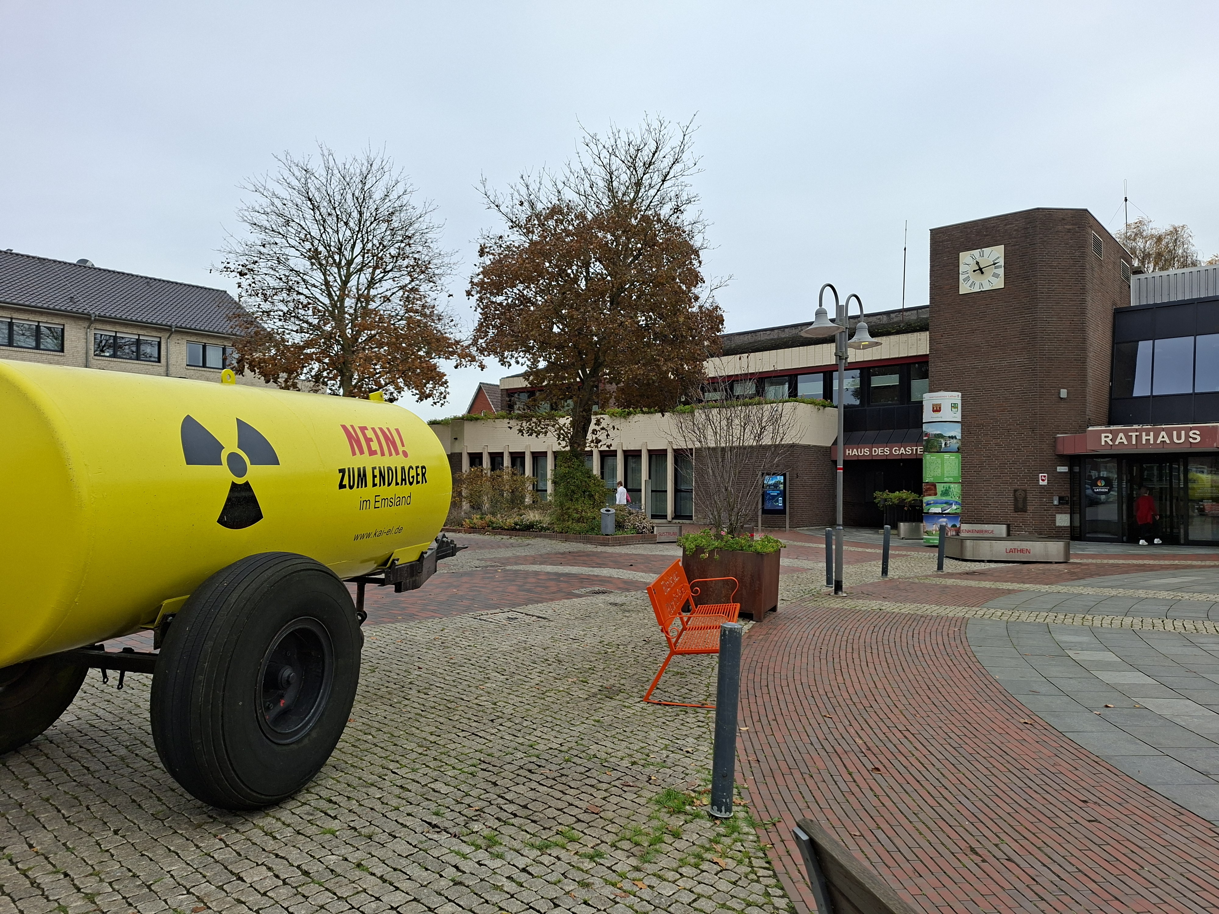 Aus diesem Anlass berichtet der Norddeutsche Rundfunk (NDR) heute ab 14:00 Uhr live online vom Marktplatz (Erna-de-Vries-Platz) in Lathen. Bereits am Vormittag hat sich der Verein „Kein Atommüllendlager im Emsland e.V.“ mit einem symbolischen „Castortransporter“ vor dem Rathaus positioniert, um auf seine ablehnende Haltung aufmerksam zu machen.