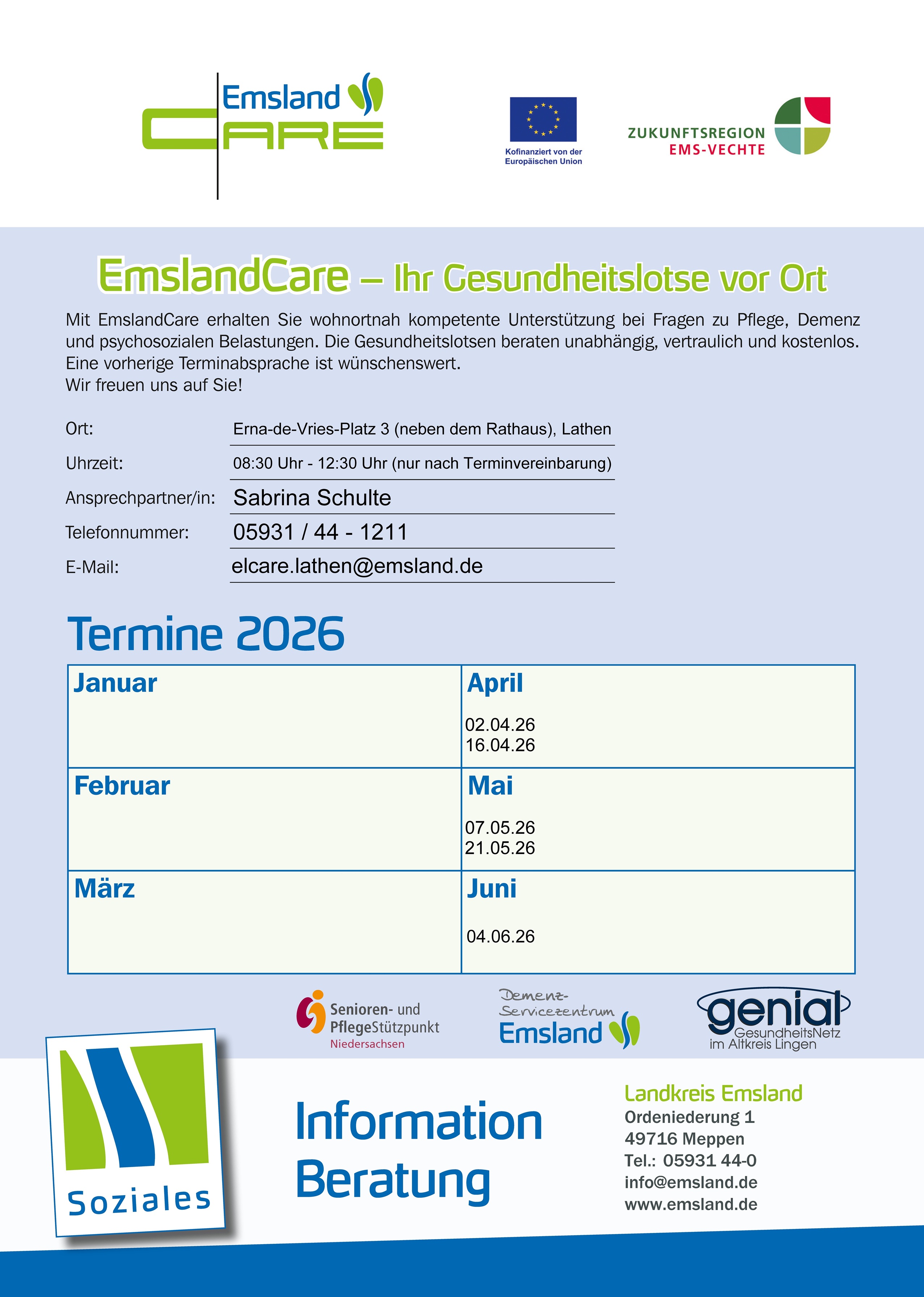 Mit dem Projekt „EmslandCare“ erweitert der Landkreis Emsland gemeinsam mit den Städten, Samtgemeinden und Gemeinden seine Unterstützungsangebote im Gesundheits- und Pflegebereich. Ziel ist es, Bürgerinnen und Bürger wohnortnah zu beraten und gleichzeitig Hausärztinnen und Hausärzte zu entlasten.