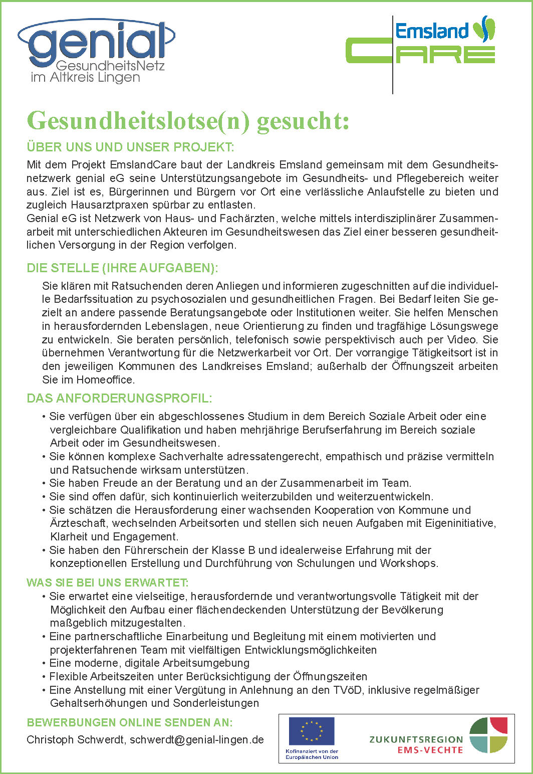 Mit dem Projekt EmslandCare erweitern der Landkreis Emsland und das Gesundheitsnetzwerk genial eG die Unterstützungsangebote im Gesundheits- und Pflegebereich. Ziel ist eine bessere Versorgung der Bürgerinnen und Bürger vor Ort sowie die Entlastung der Hausarztpraxen durch interdisziplinäre Zusammenarbeit.