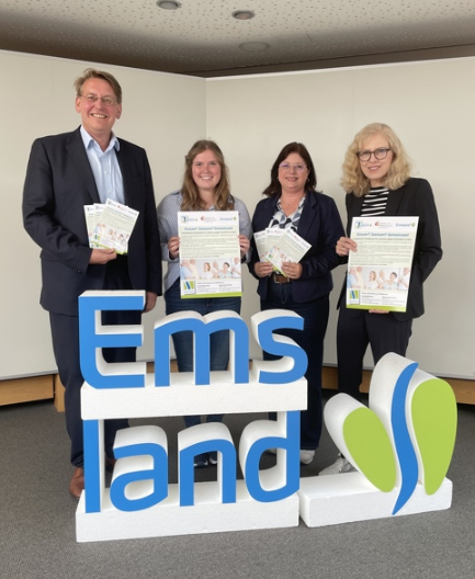 (v. l.) Landrat Marc-André Burgdorf, Daniela Fischer von der Gesundheitsregion, Kerstin Knoll vom Seniorenstützpunkt und Sozialdezernentin Dr. Sigrid Kraujuttis werben für die Teilnahme am Wettbewerb gegen Einsamkeit. (Foto: Landkreis Emsland).