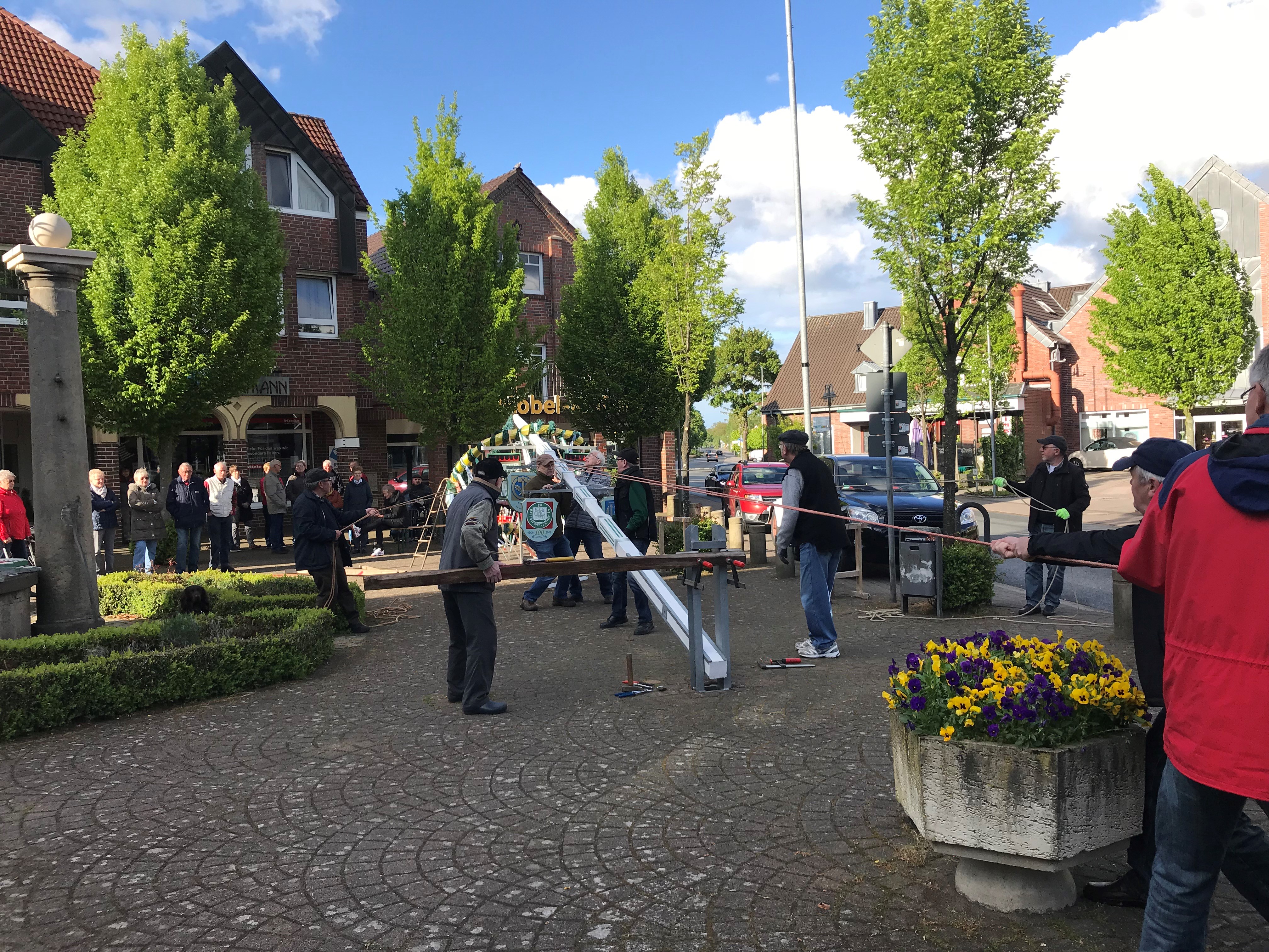 Die Mitglieder des Heimatvereins haben am 30.04.2018 traditionell den Maibaum am Marktbrunnen in Zentrum der Gemeinde aufgestellt. Lustig wehen die Bänder im Wind. Die Arbeitsgruppe wurde in diesem Jahr kräftig unterstützt vom stellvertretenden Gemeindedirektor Helmut Wilkens, wie auf dem Foto deutlich zu sehen.