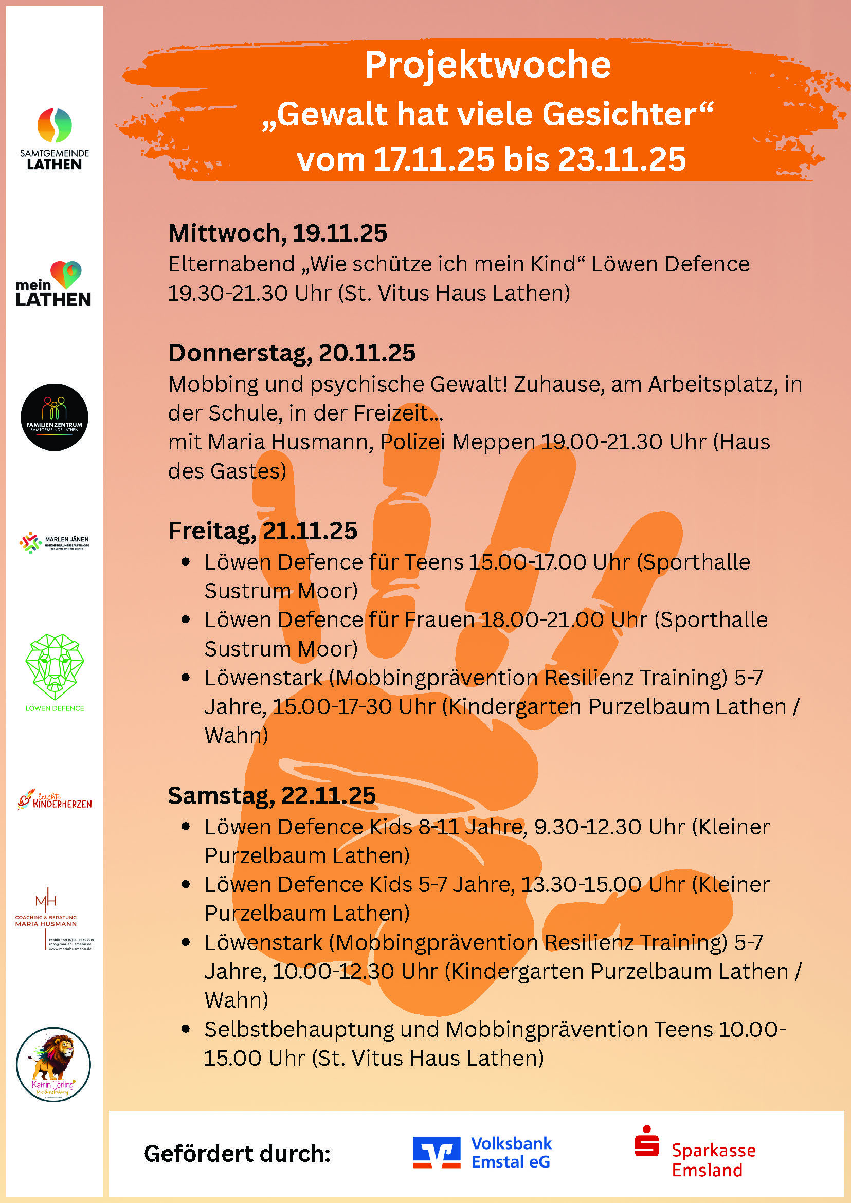 Gewalt begegnet uns in vielen Formen – laut und sichtbar, aber auch leise und versteckt. Unter dem Motto „Gewalt hat viele Gesichter“ wollen Marlen Jänen (Gleichstellungsbeauftragte SG Lathen) und Nancy Gertzen (Familienzentrum SG Lathen) sich in einer Projektwoche vom 17.11.25 bis 23.11.25 intensiv mit dem Thema auseinandersetzen. Gewalt kann viele Formen annehmen – sie kann körperlich, seelisch, verbal oder digital sein. Oft ist sie nicht auf den ersten Blick erkennbar, ihre Folgen aber umso schwerwiegender. In unserer Projektwoche „Gewalt hat viele Gesichter“ setzen wir uns mit verschiedenen Erscheinungsformen von Gewalt auseinander und entwickeln gemeinsam in den unterschiedlichen Workshops Strategien, um ihr vorzubeugen.