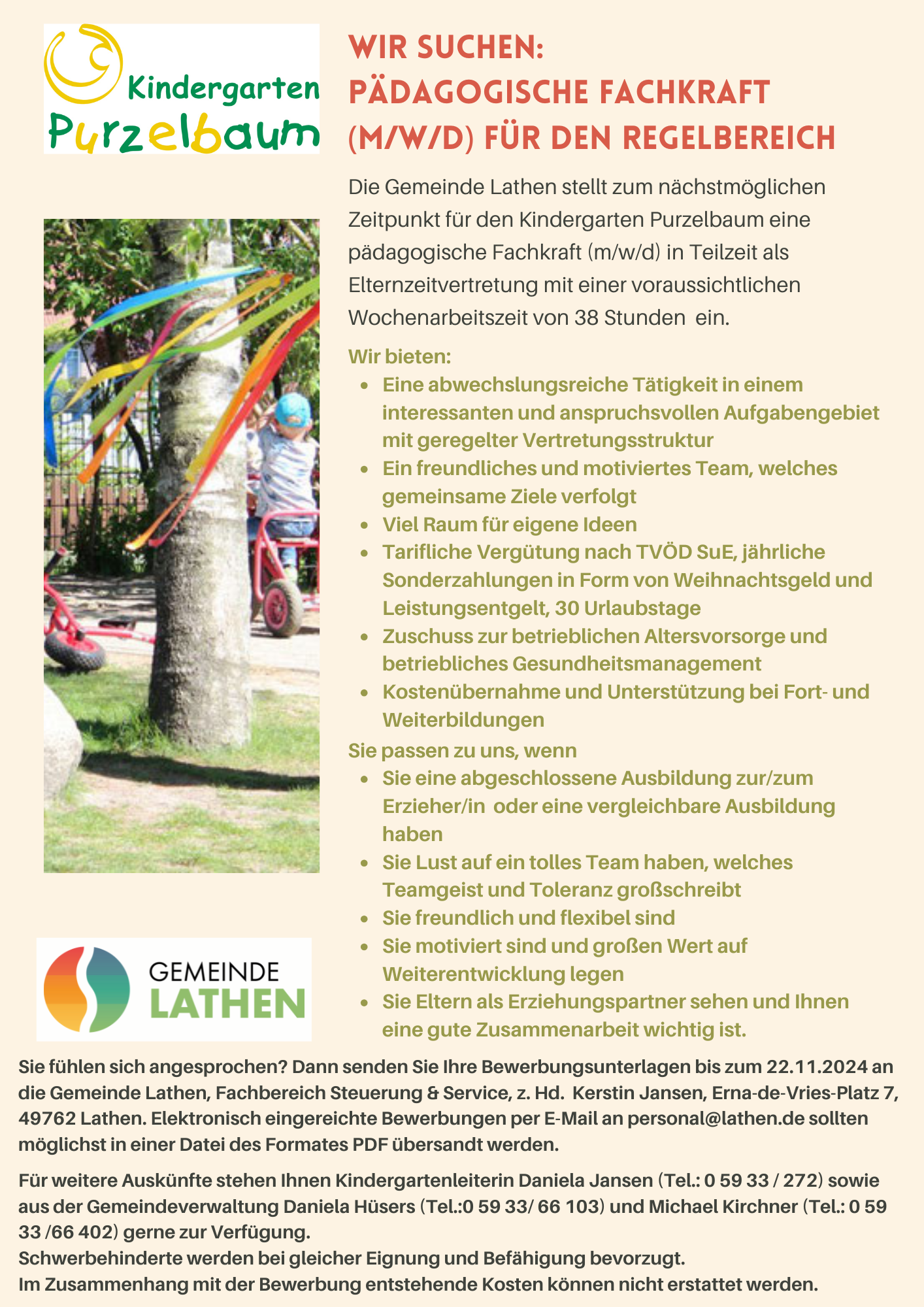 Wir suchen: Pädagogische Fachkraft (M/W/D) für den Regelbereich Nov. 13, 2024 | Startseite, Uncategorized
